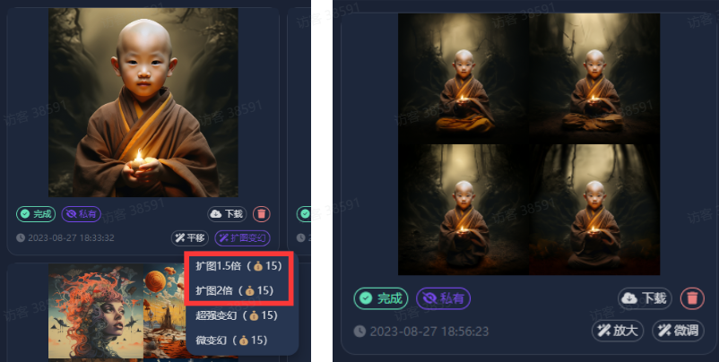 扩图功能的含义就是我们通常理解的放大。在生成一张图片之后,你可以基于原图进行放大,AI会智能的进行填充,帮助你更细致的看到图片的每一个细节。🧩🔎